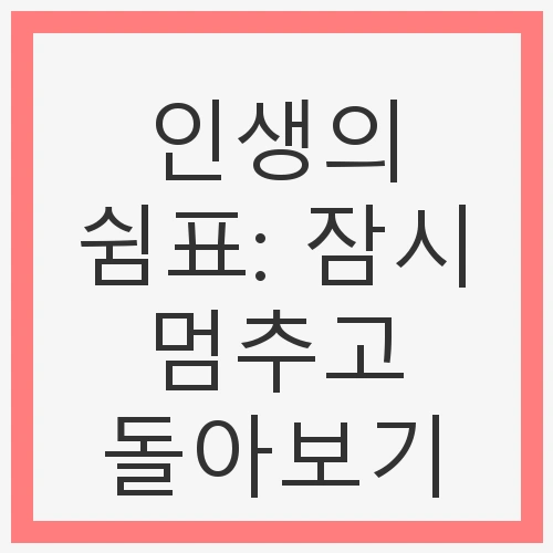인생의 쉼표는 단순한 휴식을 넘어 우리의 삶을 풍요롭게 만드는 중요한 요소입니다. 우리가 조급한 마음을 내려놓고 잠시 멈춰 서서 자신을 돌아보는 것은 삶의 질을 높이는 데 큰 영향을 미칩니다. 따라서 일상 속에서 쉼표를 찍는 것을 잊지 말고, 스스로를 챙기는 여유를 가져보시길 바랍니다.